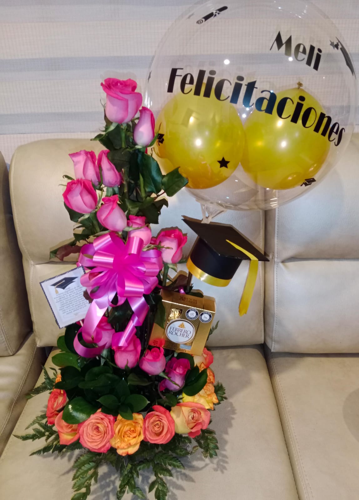 Sé el primero en valorar “Caracol de rosas con gorro de grado, globo burbuja personalizado, y ferrero por 4”